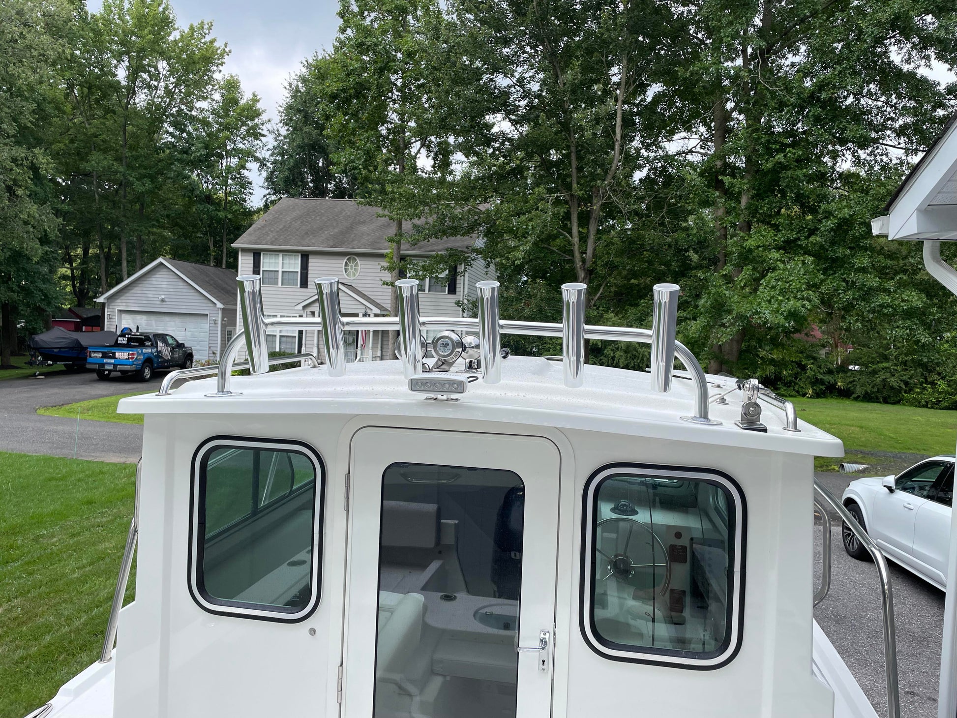 fits common cabin boats (Parker , C-Hawk etc.) or other angled fiberglass top.